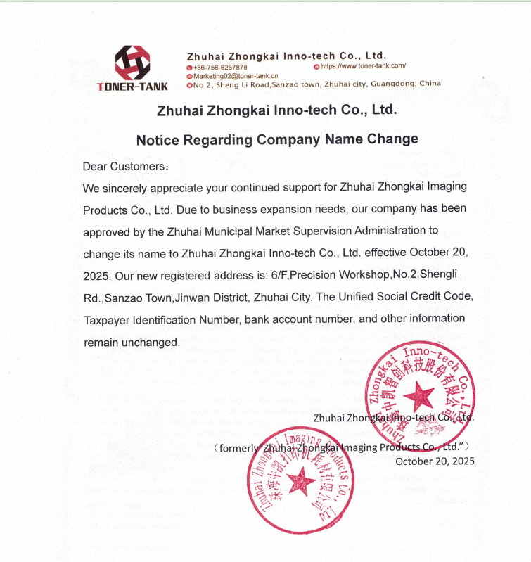 We sincerely appreciate your continued support for Zhuhai Zhongkai Imaging Products Co., Ltd. Due to business expansion needs, our company has been approved by the Zhuhai Municipal Market Supervision Administration to change its name to Zhuhai Zhongkai Inno-tech Co., Ltd. effective October 20, 2025. Our new registered address is: 6/F,Precision Workshop,No.2,Shengli Rd.,Sanzao Town,Jinwan District, Zhuhai City. The Unified Social Credit Code, Taxpayer Identification Number, bank account number, and other information remain unchanged.